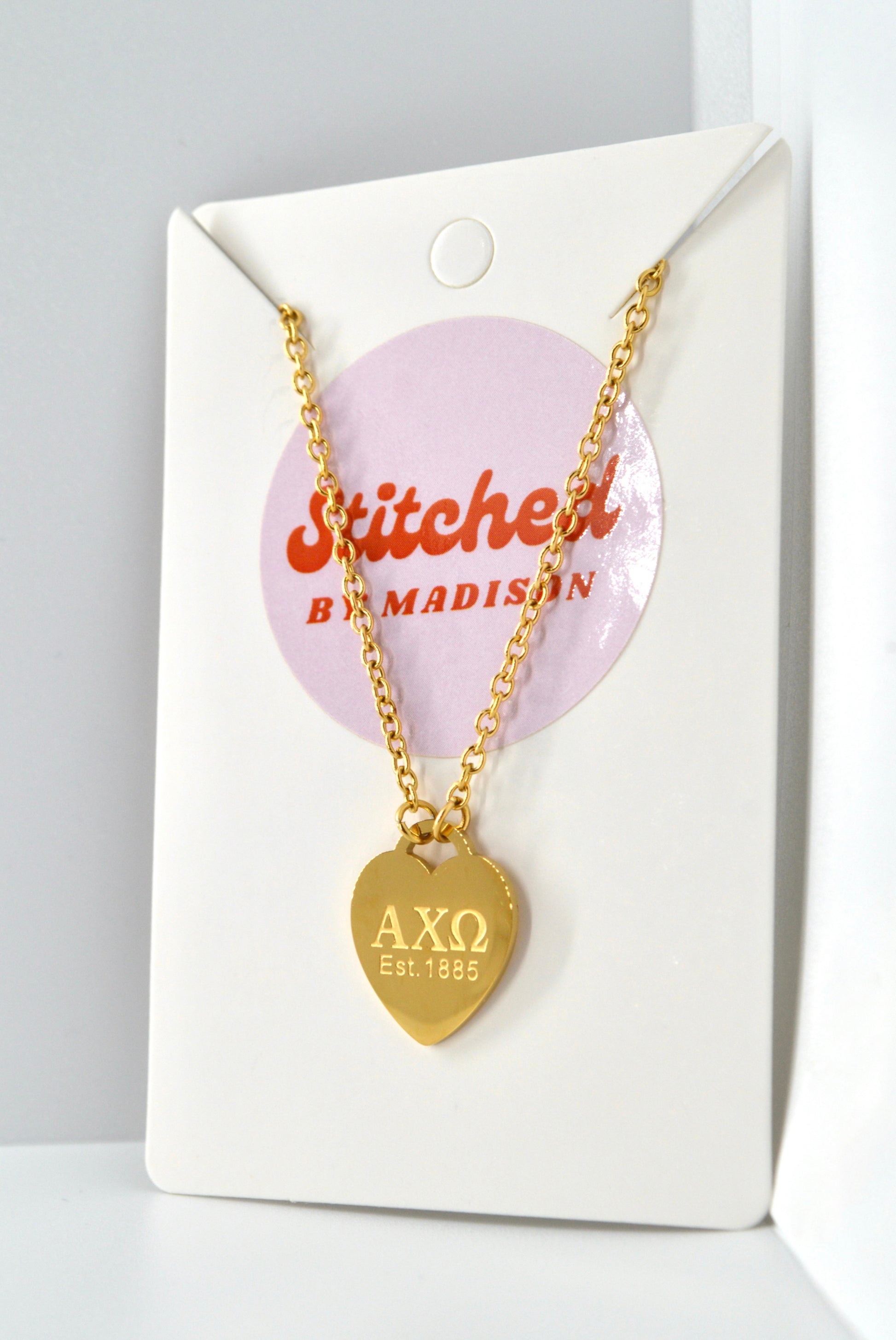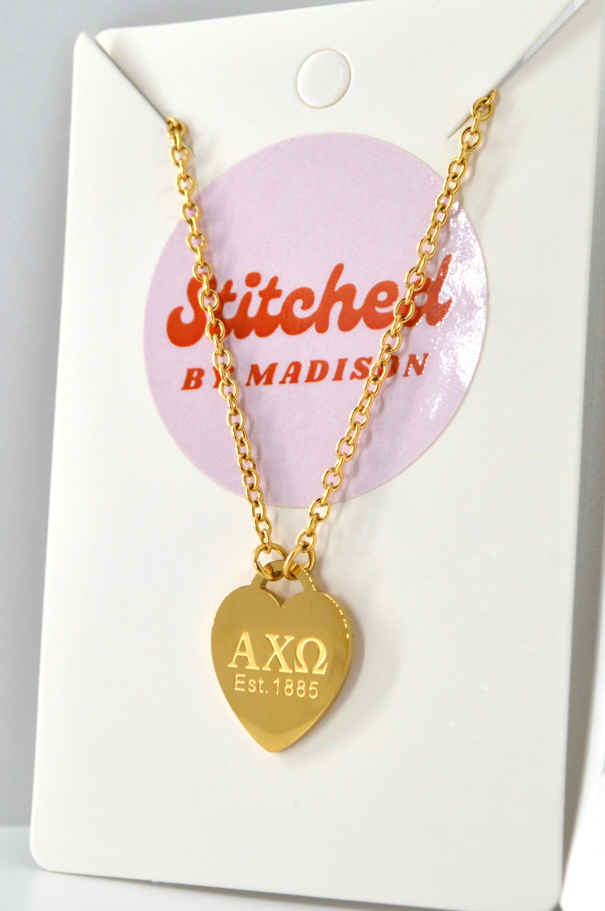 Our Sorority Heart Necklace features a timeless heart shaped pendant engraved with your sorority’s Greek letters and founding year. Each necklace is crafted from the highest quality stainless steel and PVD Gold plating. PVD Gold plating is much higher quality than regular gold plating, making our necklaces water resistant, tarnish free, and hypoallergenic! They are perfect for daily wear! The classic 18” chain is paired with a 3/4” heart tag for a clean elegant look that layers beautifully or stands on its own.