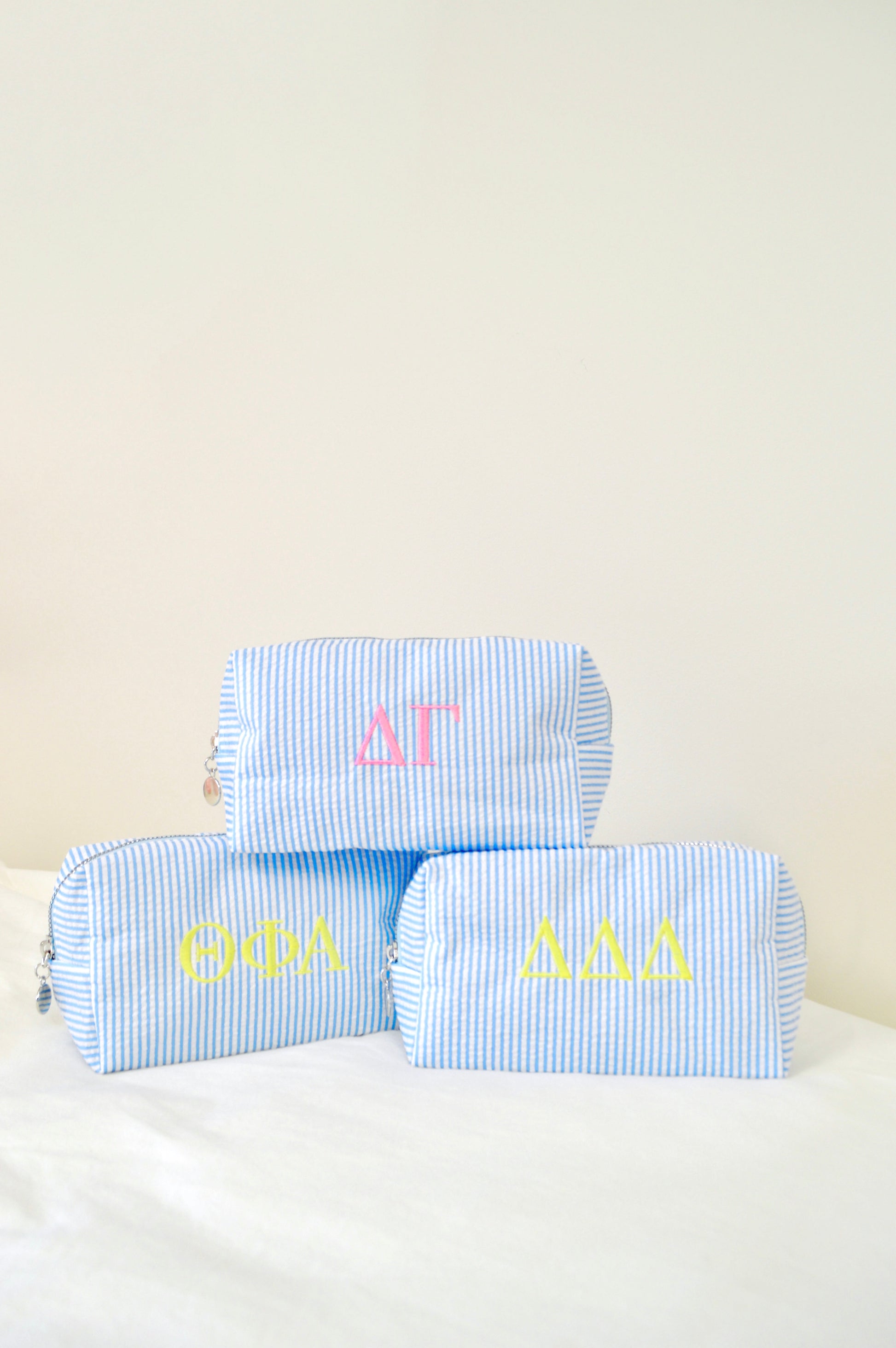 Keep your everyday essentials organized in style with our embroidered sorority cosmetic bags!! Each bag is custom embroidered with your sorority’s Greek letters, creating a simple but elevated piece perfect for showing your sisterhood wherever you go.