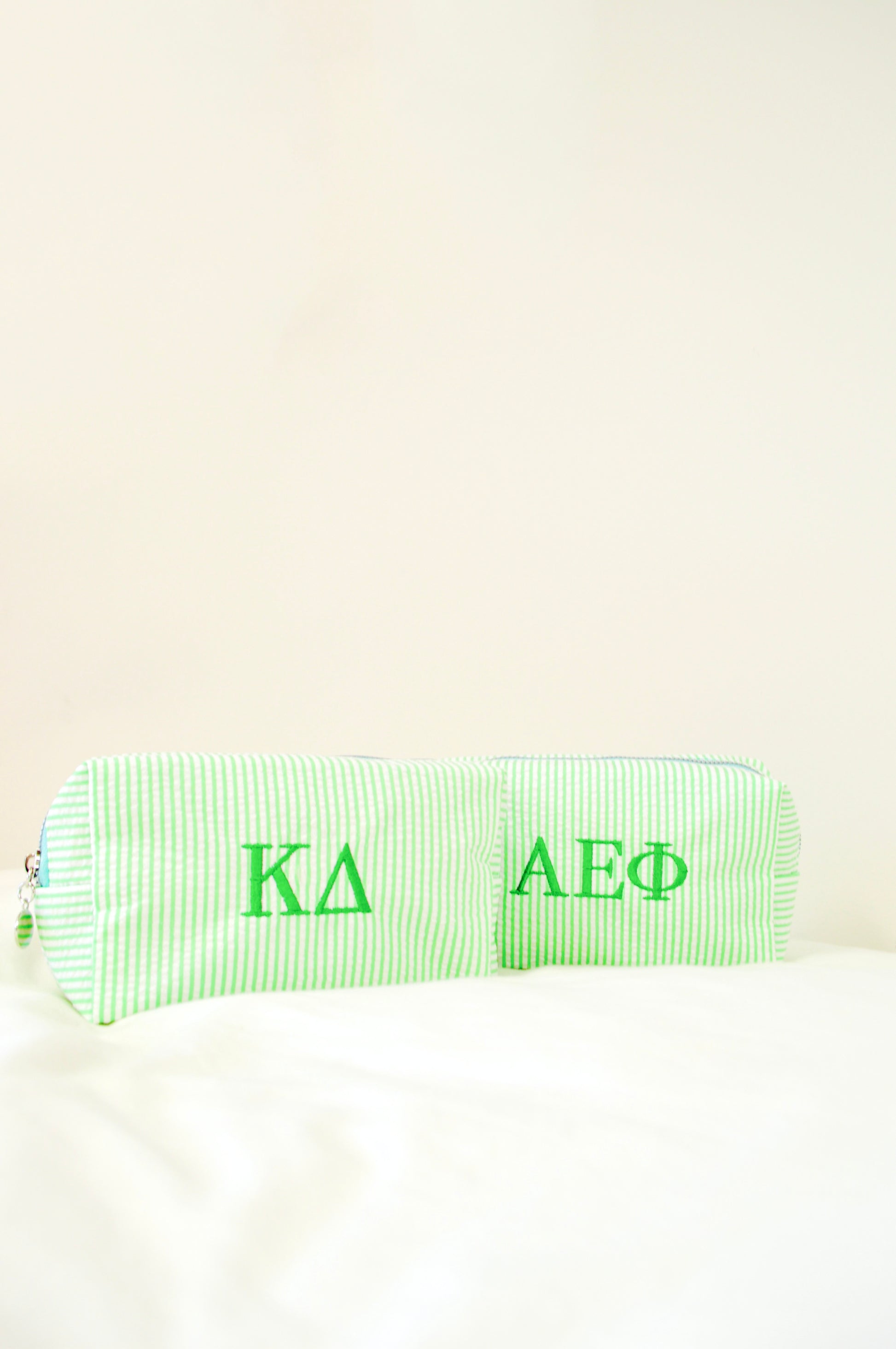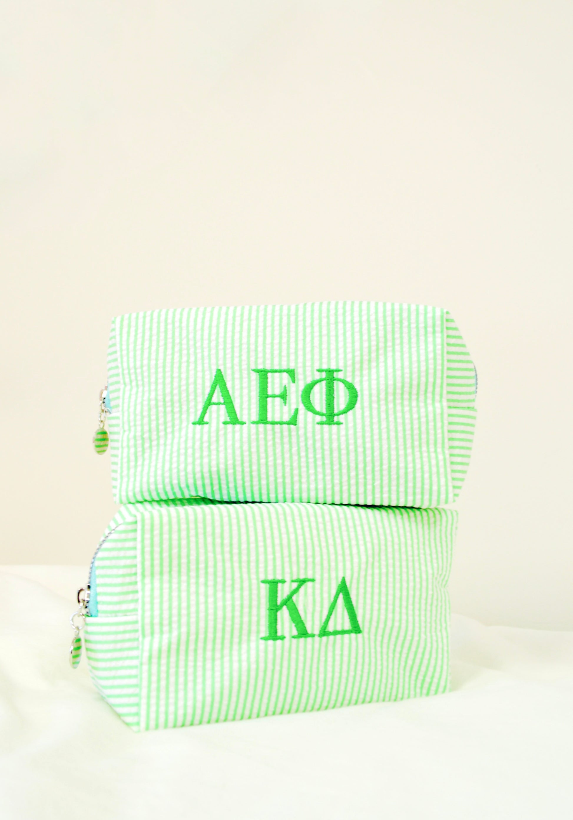 Keep your everyday essentials organized in style with our embroidered sorority cosmetic bags!! Each bag is custom embroidered with your sorority’s Greek letters, creating a simple but elevated piece perfect for showing your sisterhood wherever you go.