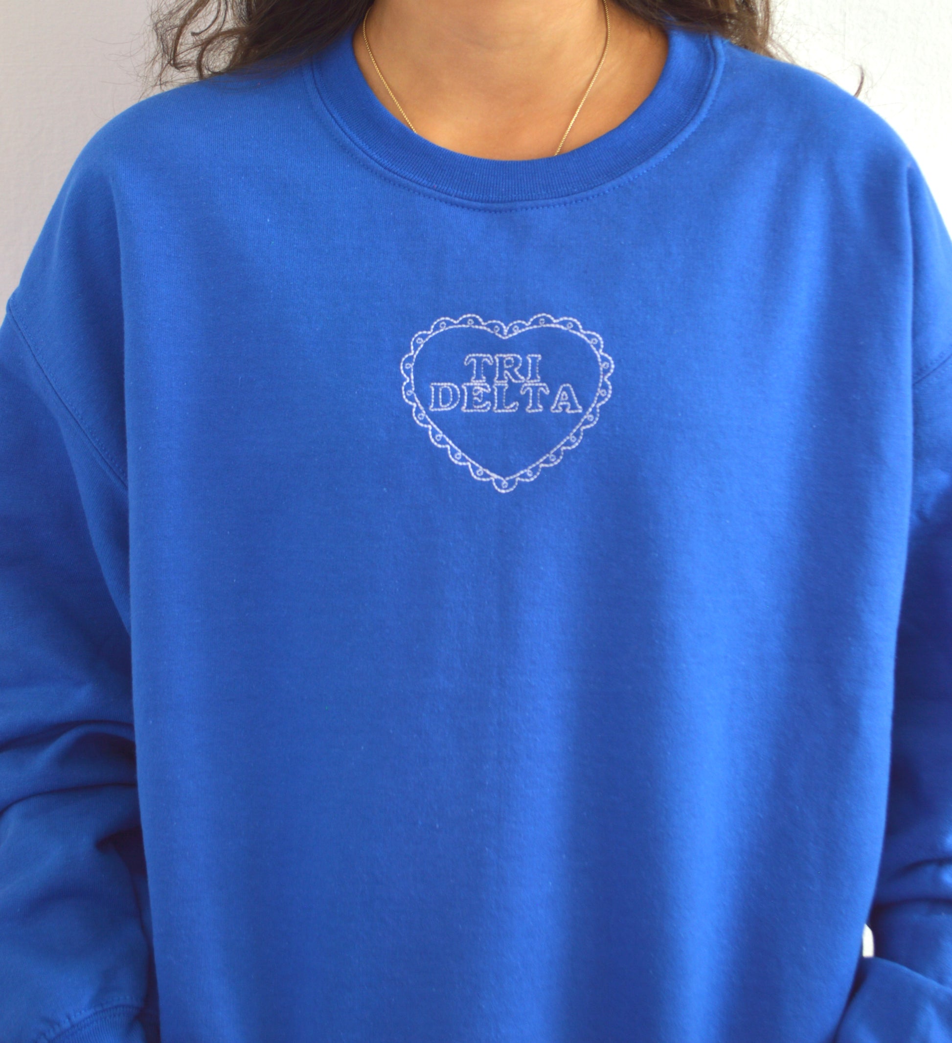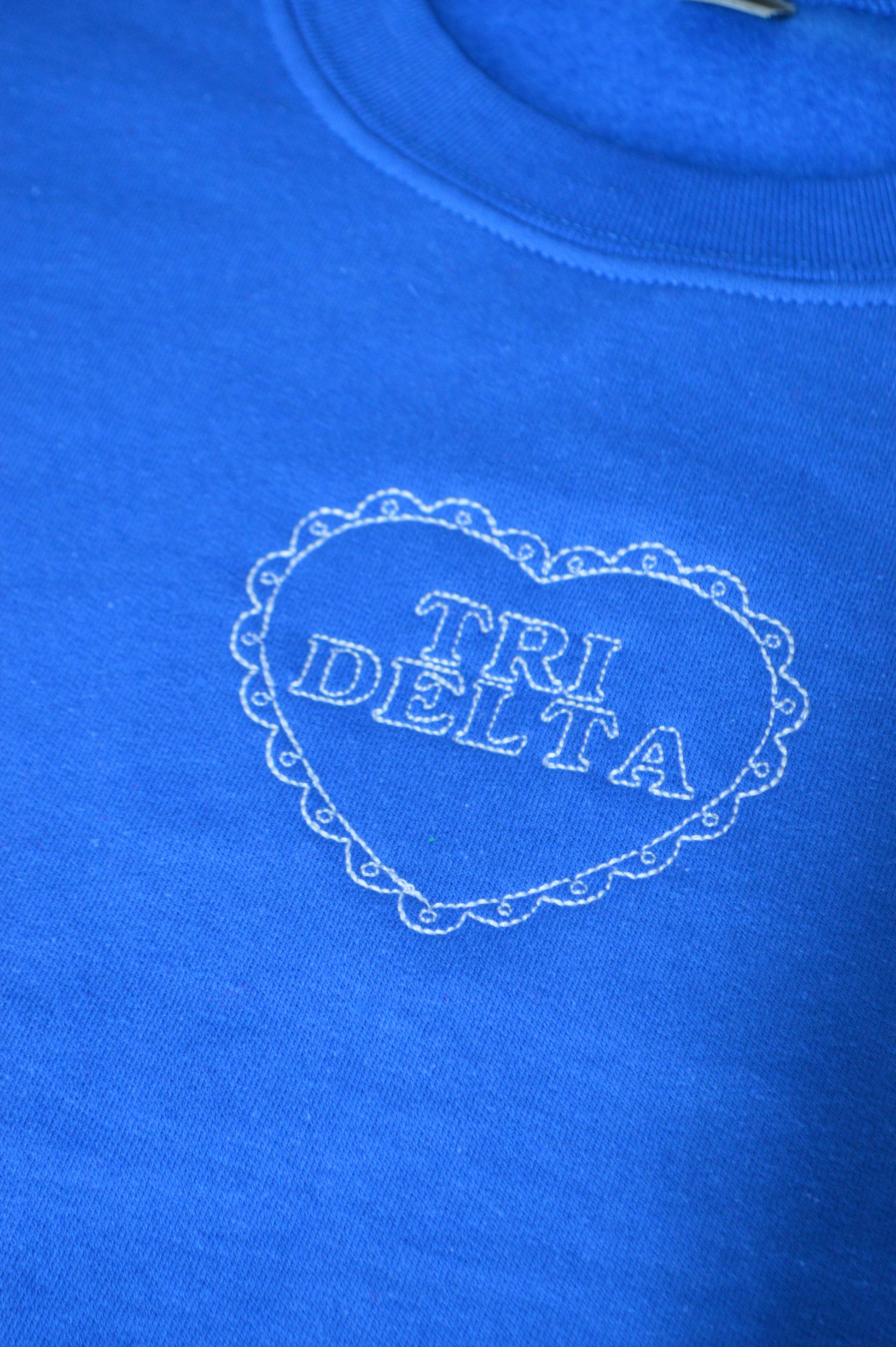 Rep your sisterhood with our TRI DELTA heart crewneck! Made with a comfortable 50/50 blend of cotton and polyester. This sweatshirt features an adorable embroidered TRI DELTA heart design and classic crewneck style.